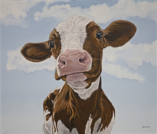 Koeien en stieren schilder ik vrij veel omdat deze dieren grote uitdrukkingsvolle gezichten en een bottige anatomie hebben, en ik vind het prettig om vacht te schilderen.